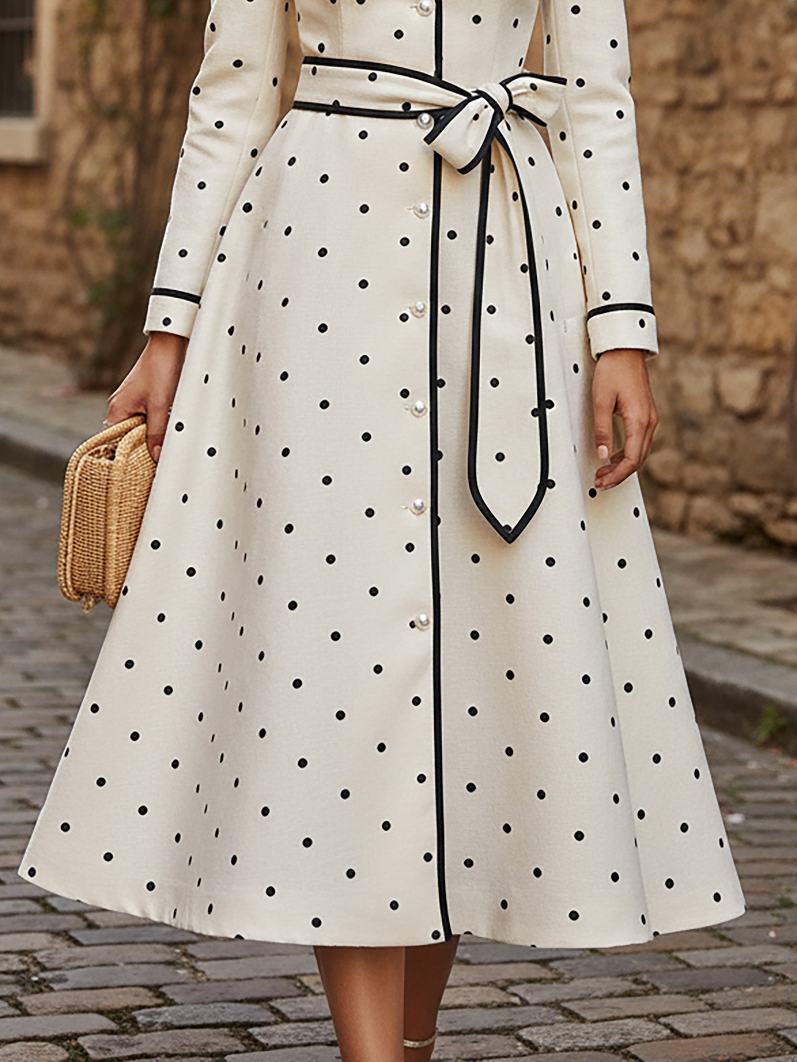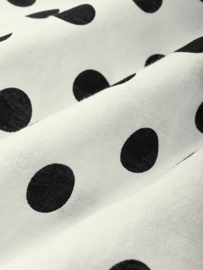 Midi Linen Dress, Long Sleeves, Lapel Collar, Polka Dots, Button Design, Vintage, Ivory