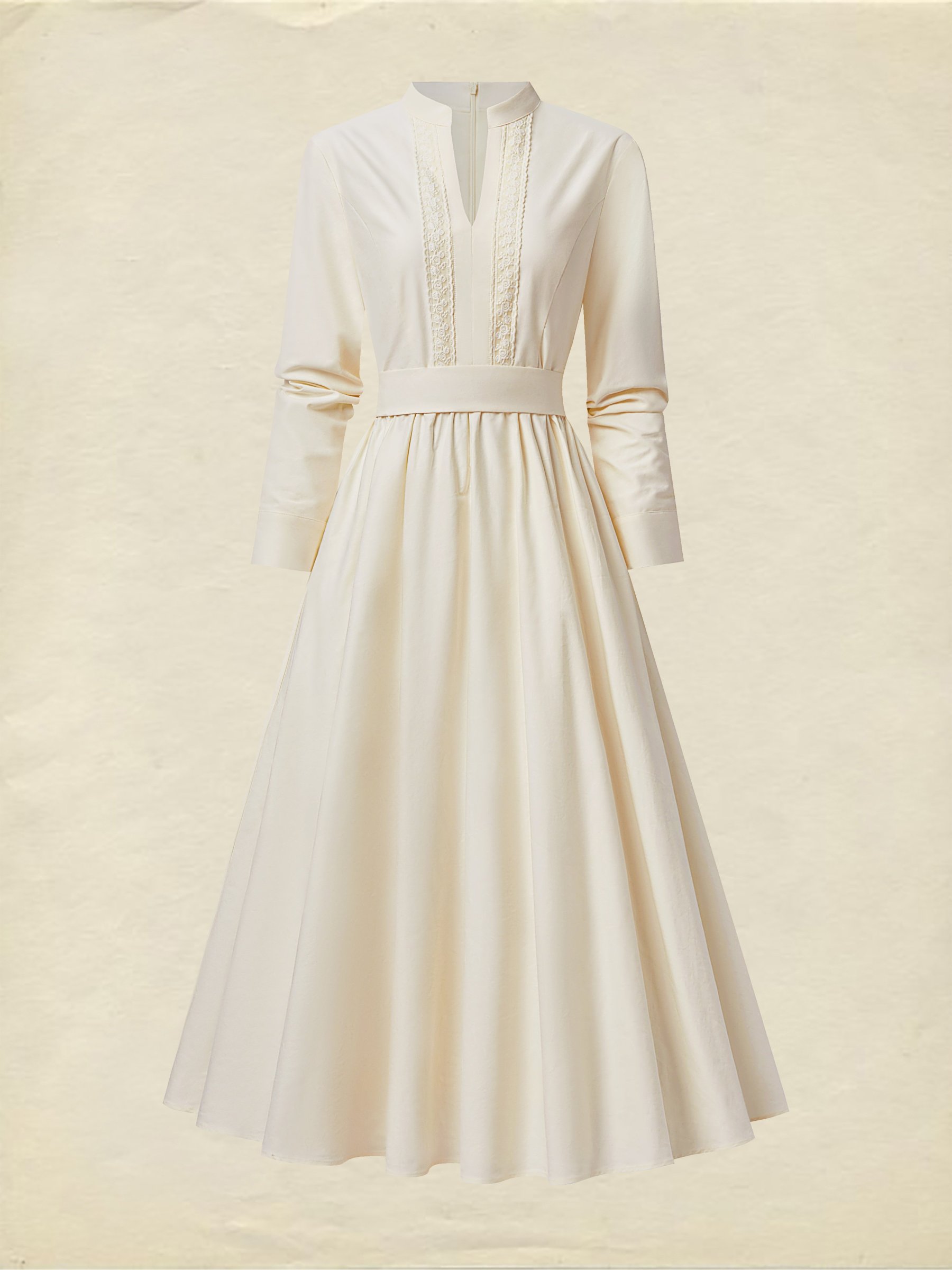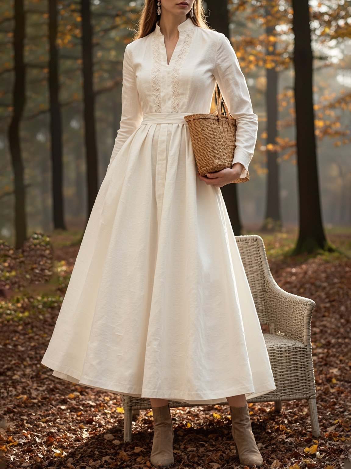 Maxi Cotton Dress, Long Sleeves, V Neck, Plain, Lace, Vintage, White