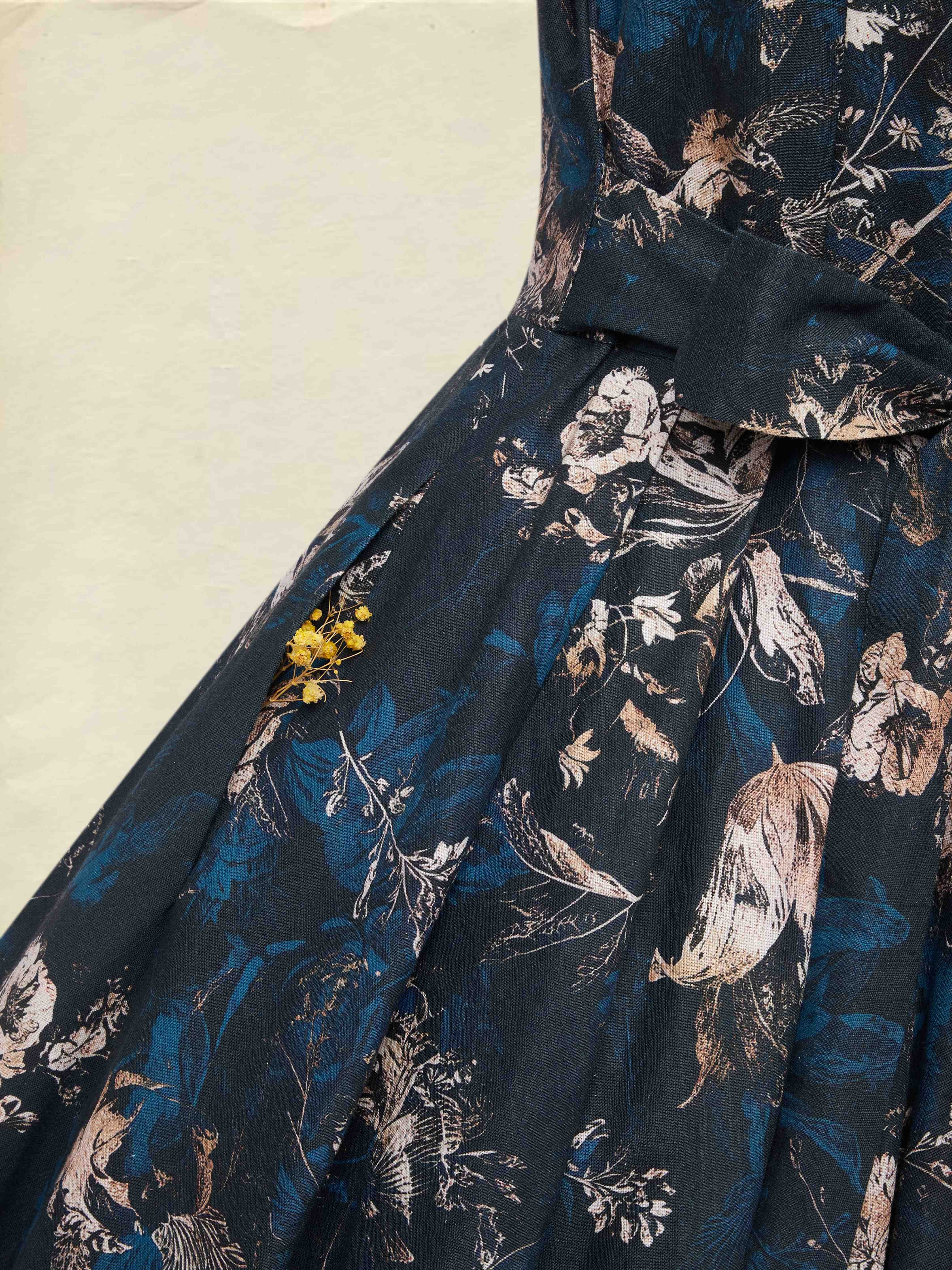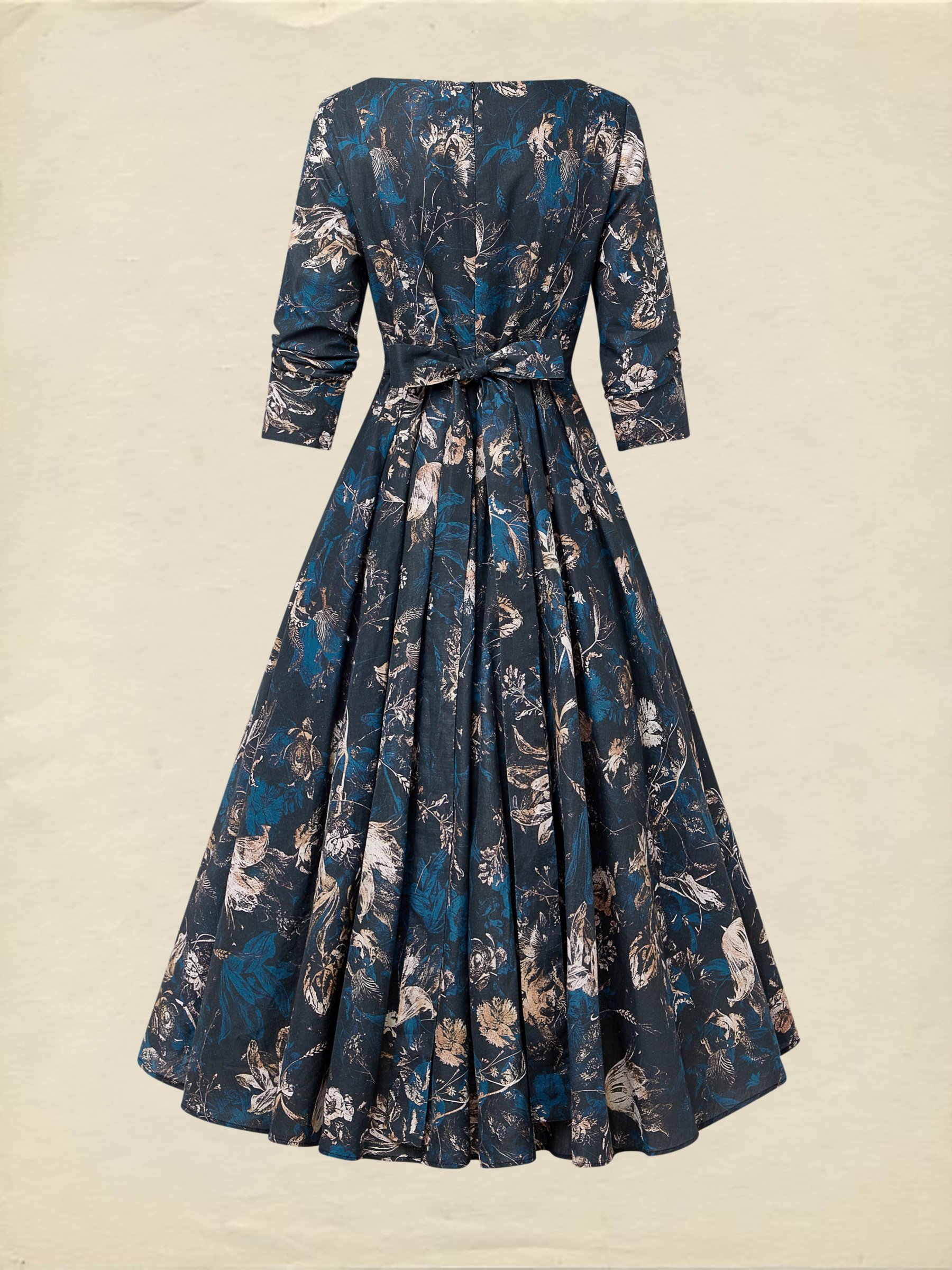 Midi Linen Dress, Long Sleeves, V Neck, Floral, Button Design, Vintage, Deep Blue
