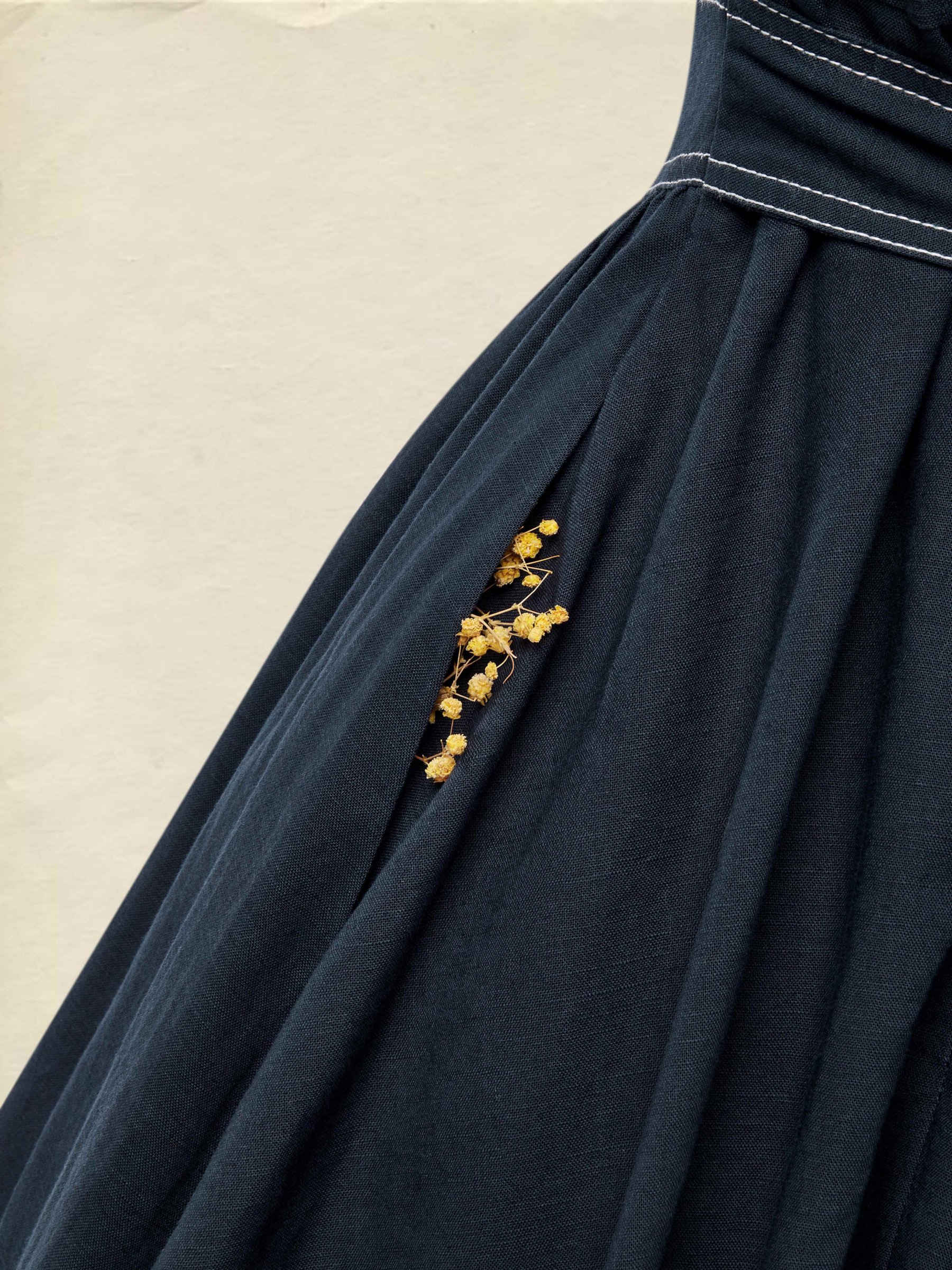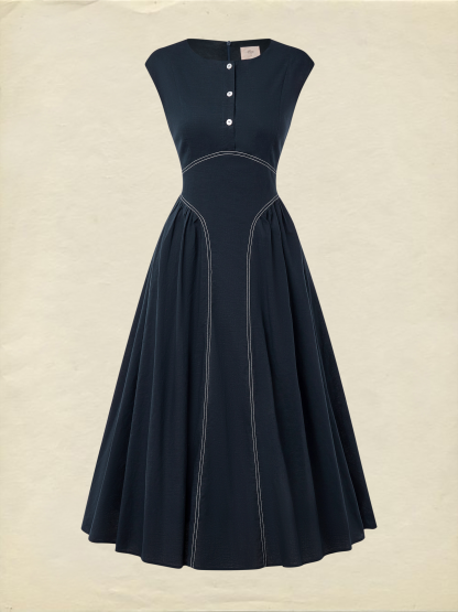 Maxi Linen Dress, Cap Sleeves, Crew Neck, Plain, Pocket Design, French Vintage, Blue
