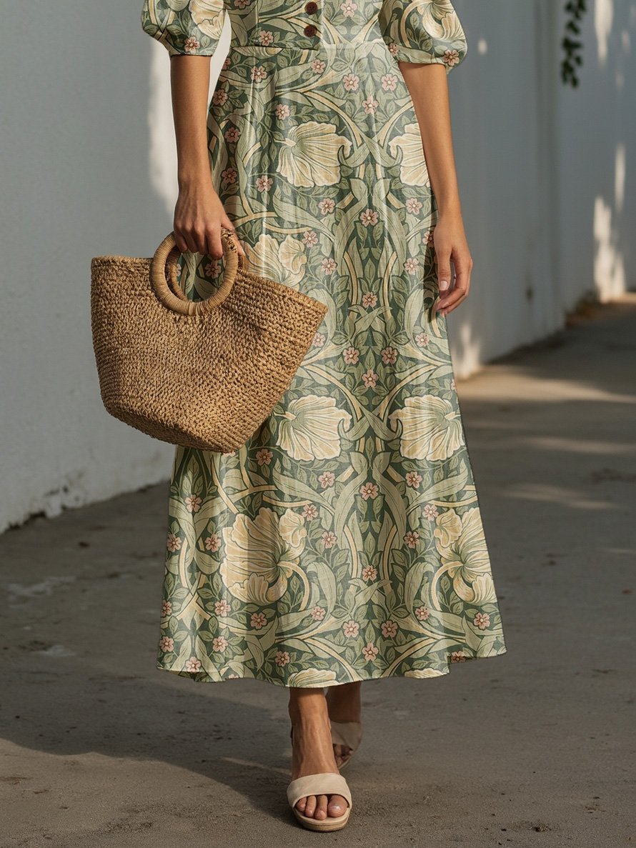Maxi Linen Dress, Half Sleeve, Lapel Collar, Paisley, Button Design, Vacation, Vintage, Green