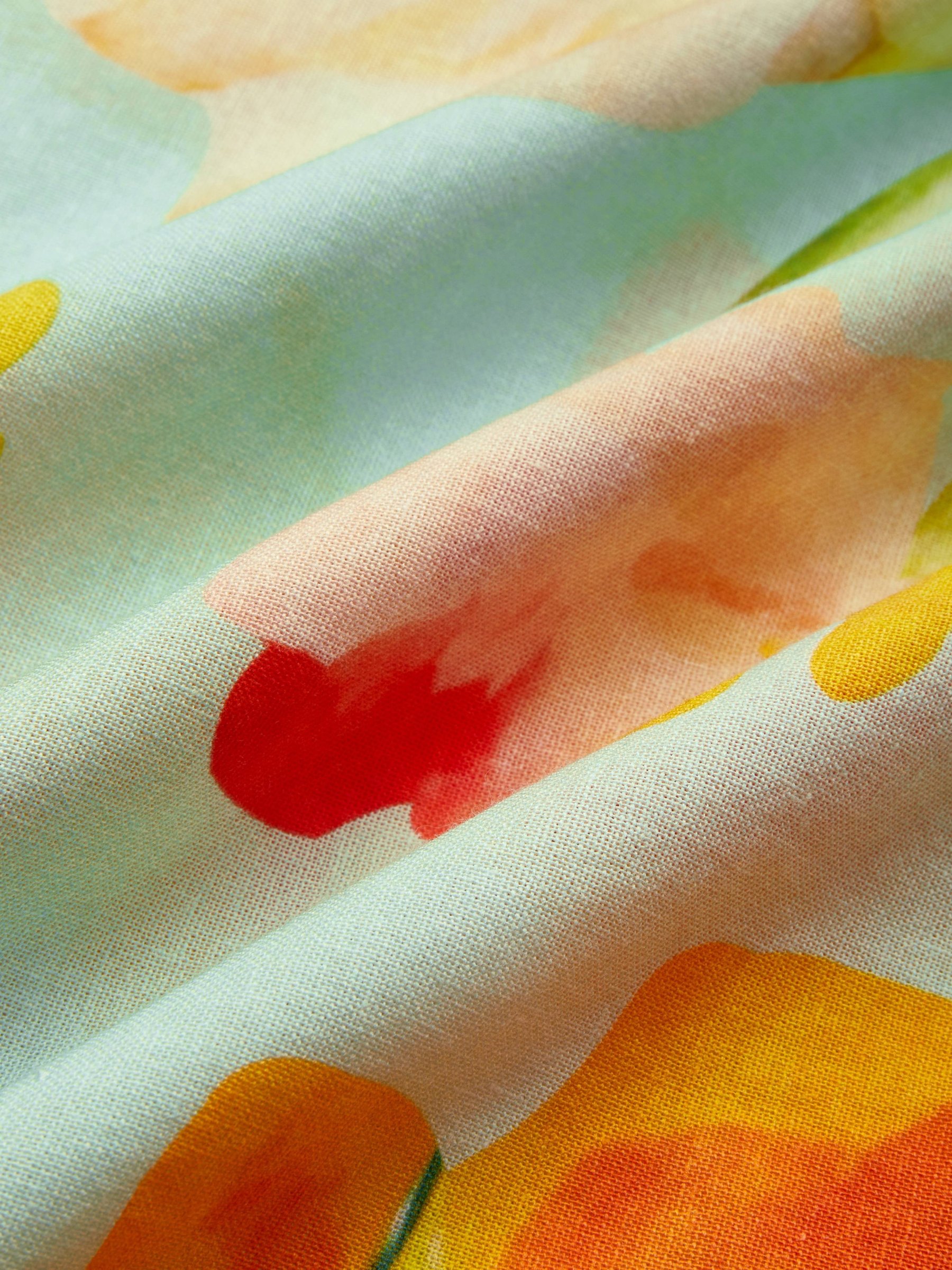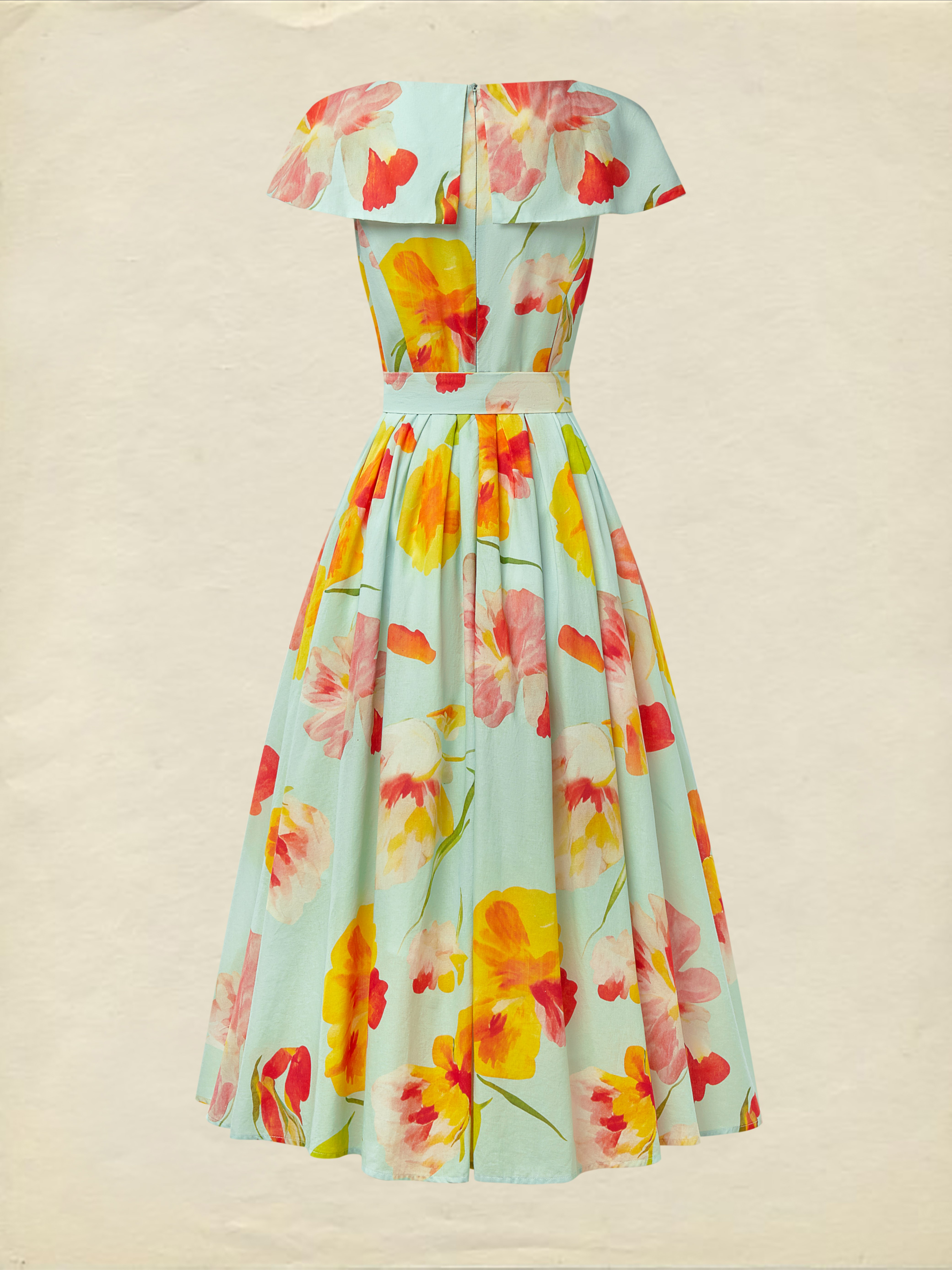 Midi Linen Dress , Short Sleeves, V Neck, Floral, Pocket Design, Vacation, Vintage, Green