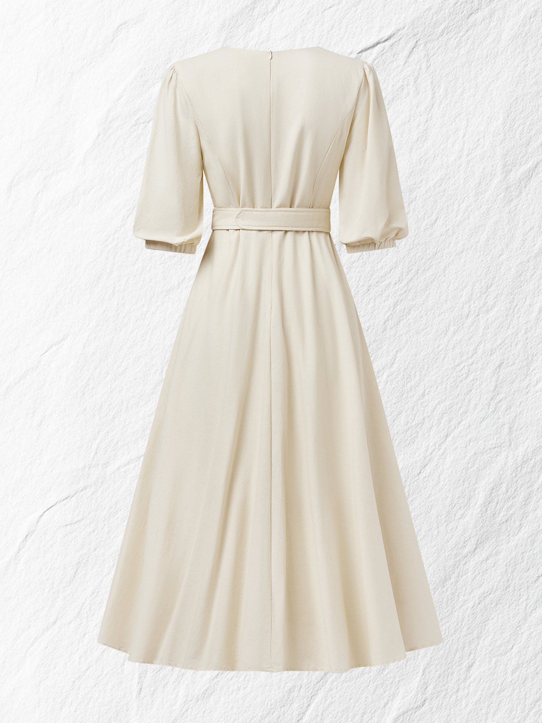 Maxi Cotton Dress, Balloon Sleeve, V Neck, Plain, Belt Design, Vintage, Khaki