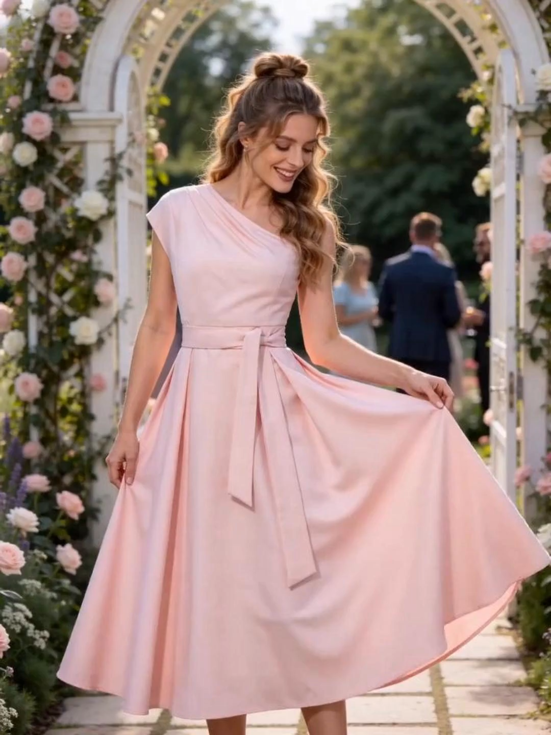 Maxi Cotton Dress , Sleeveless, One shoulder, Plain, Belt Design, Vintage, Light Pink