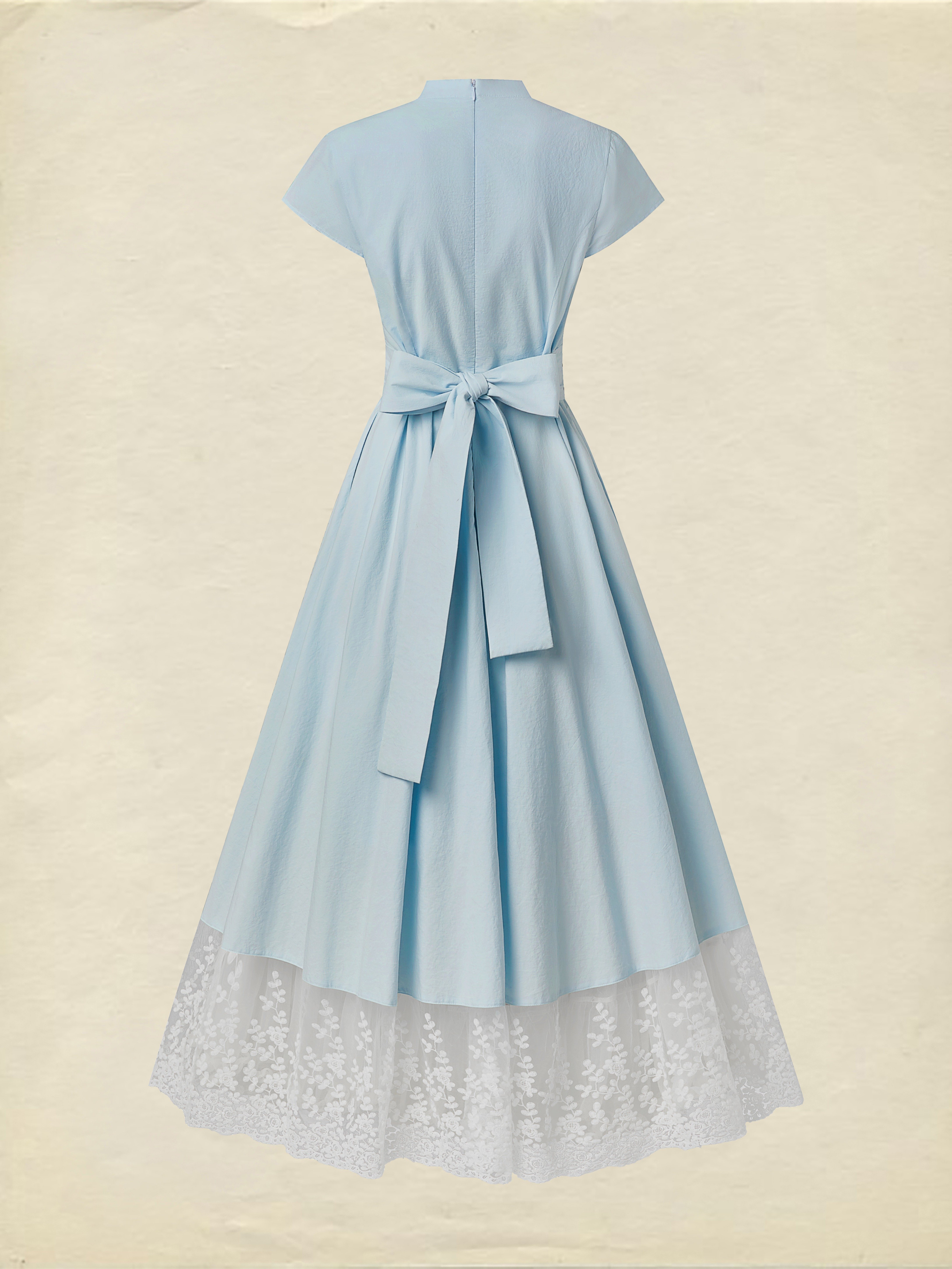Maxi Cotton Dress , Short Sleeves, V Neck, Plain, Lace, French Vintage, Aqua blue