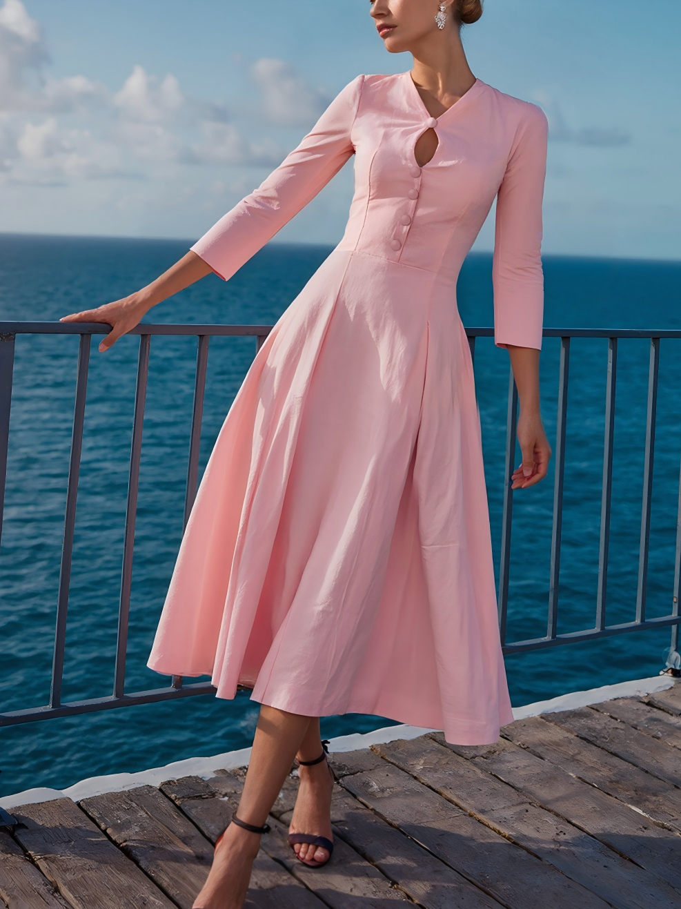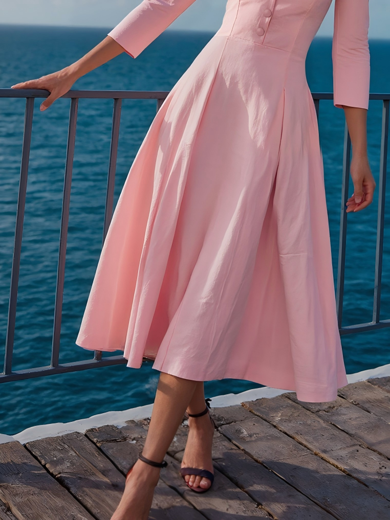 Midi Cotton Dress , Half Sleeve, V Neck, Plain, Button Design, French Vintage, Pink