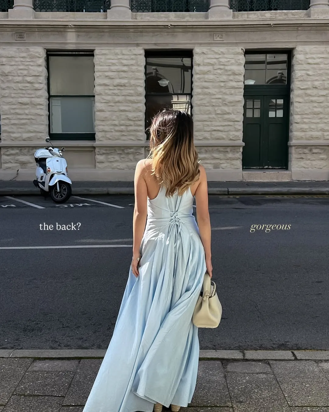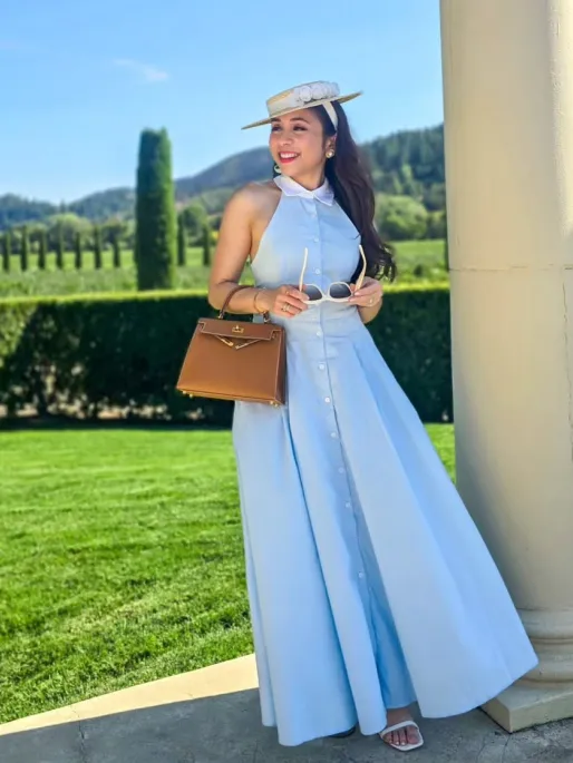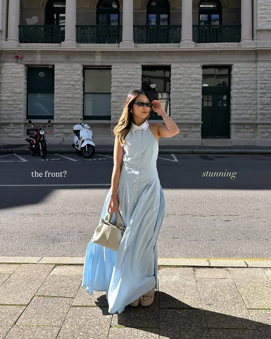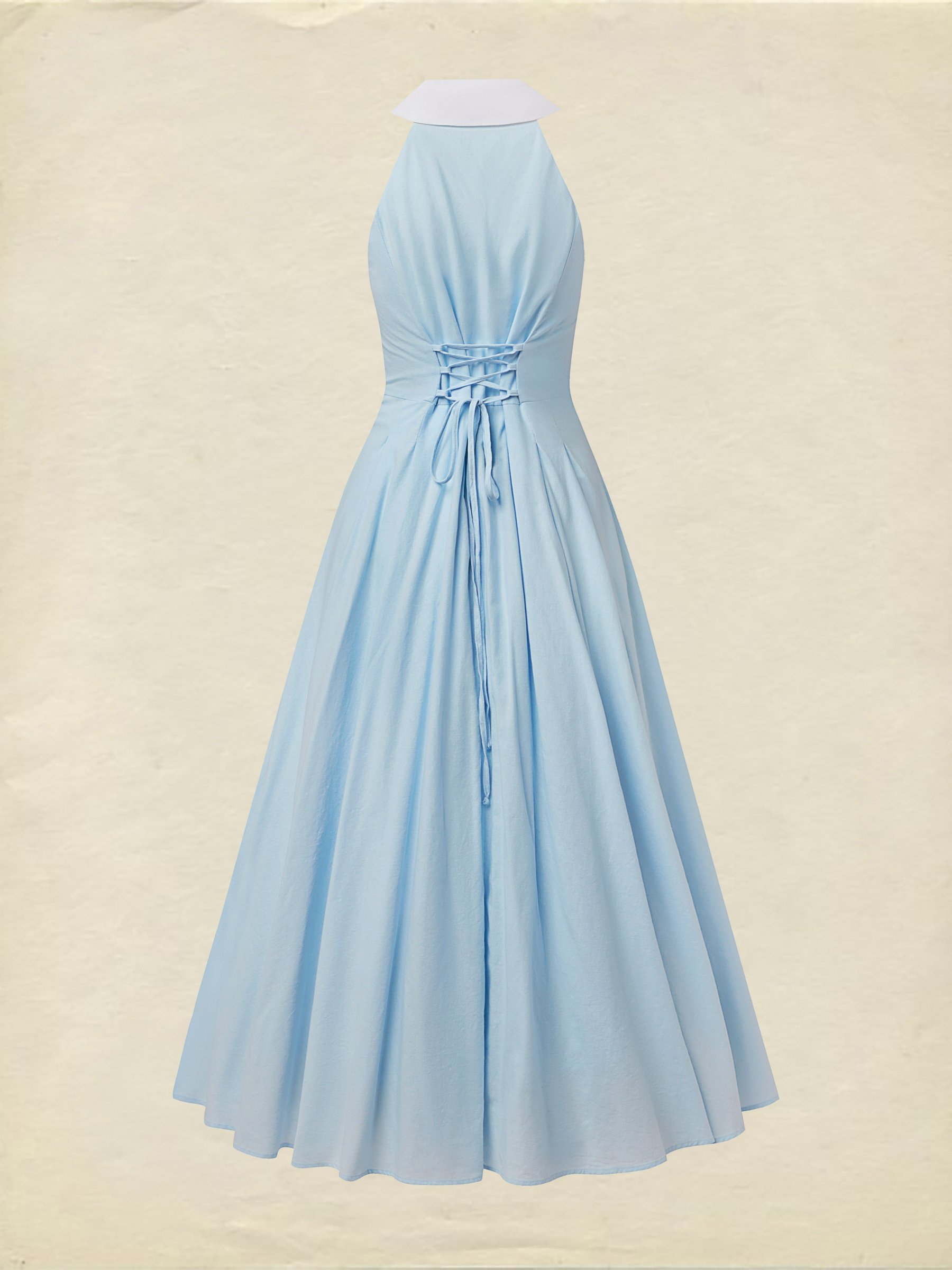 Maxi Linen Dress, Sleeveless, Shawl Collar, Plain, Button Design, Vintage, Blue