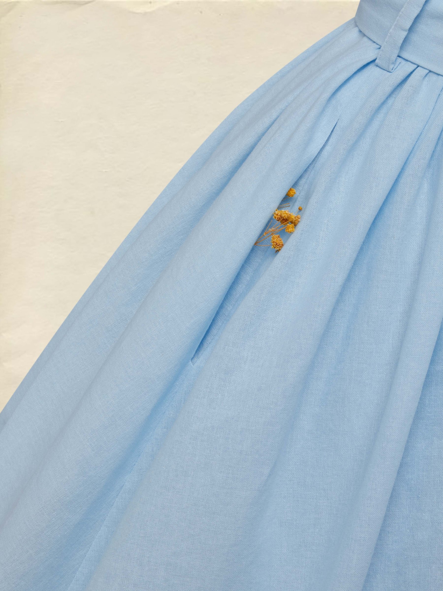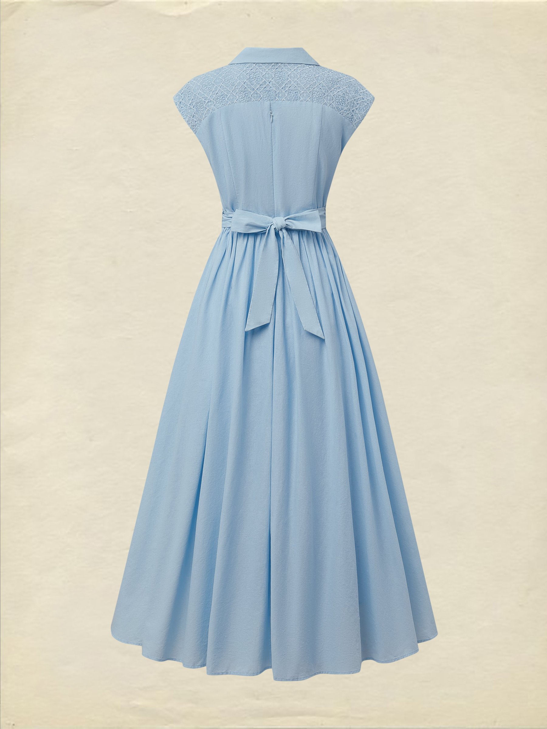 Maxi Linen Dress , Cap Sleeves, Shawl Collar, Plain, Lace, Vintage, Blue