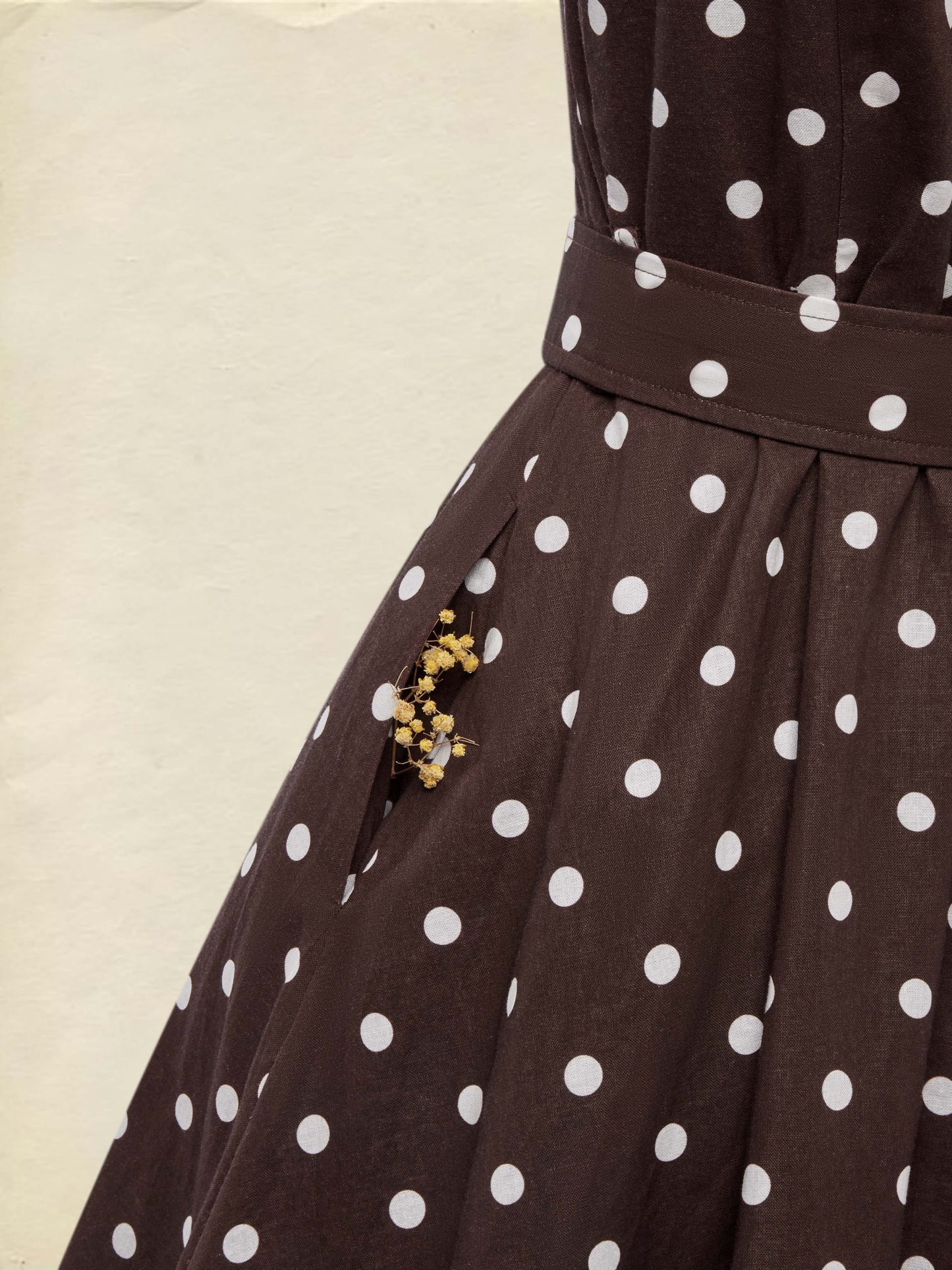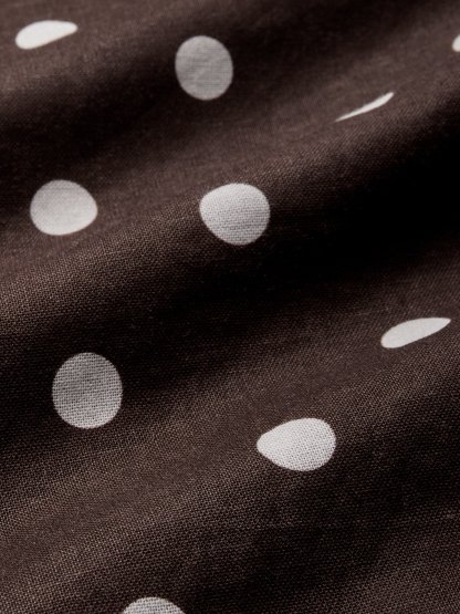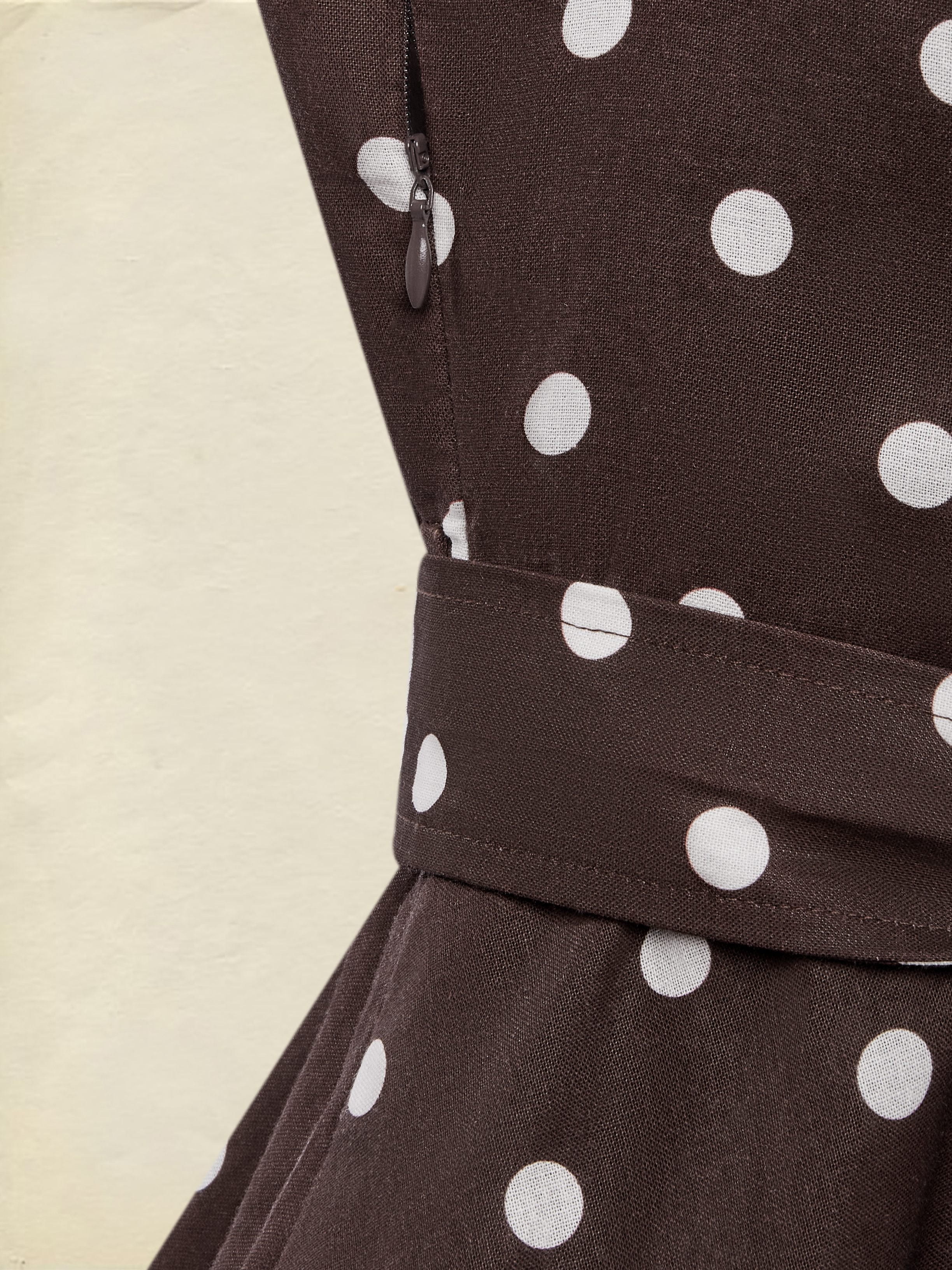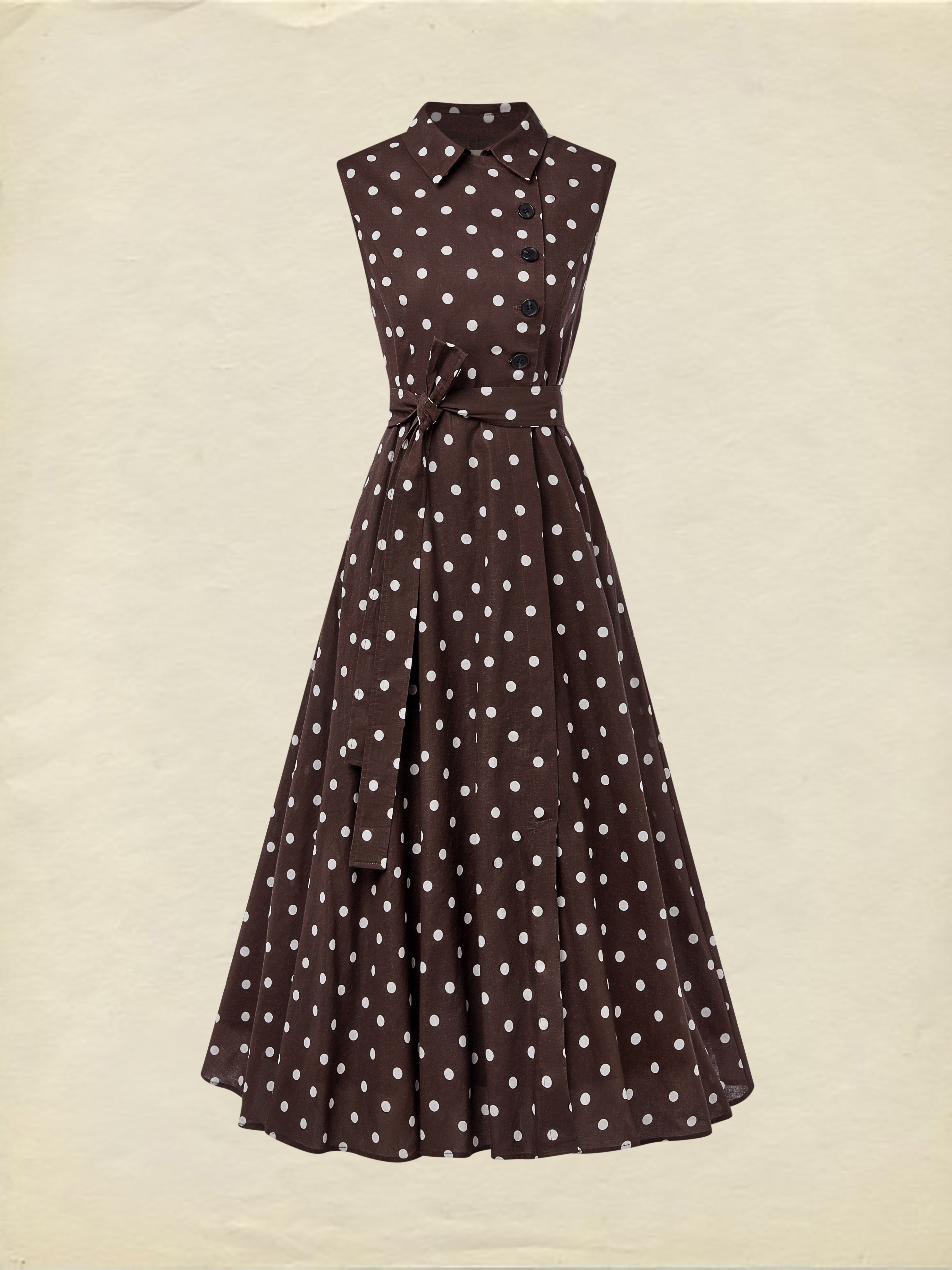 Midi Cotton Dress , Sleeveless, Shawl Collar, Polka Dots, Button Design, French Vintage, Coffee